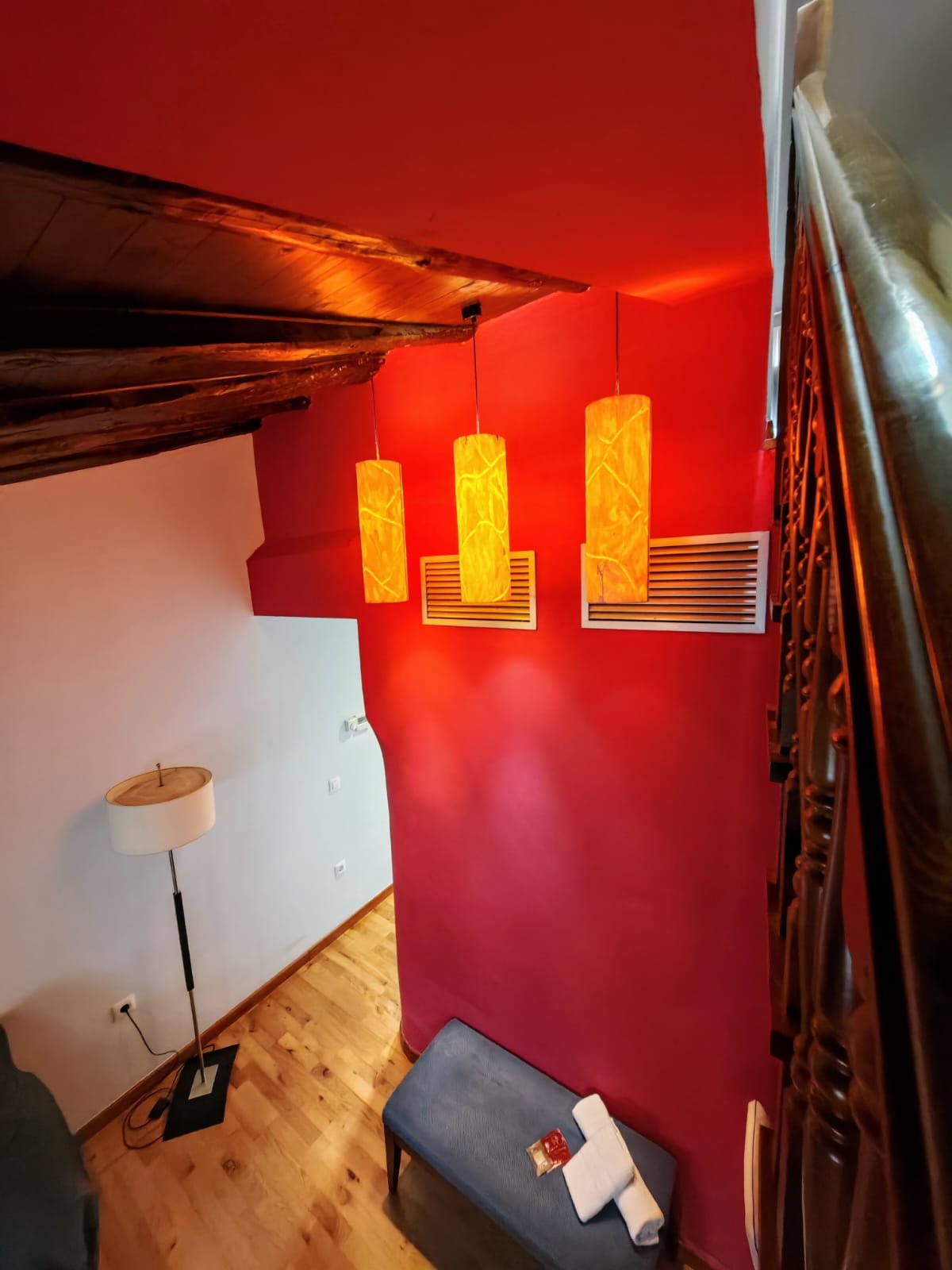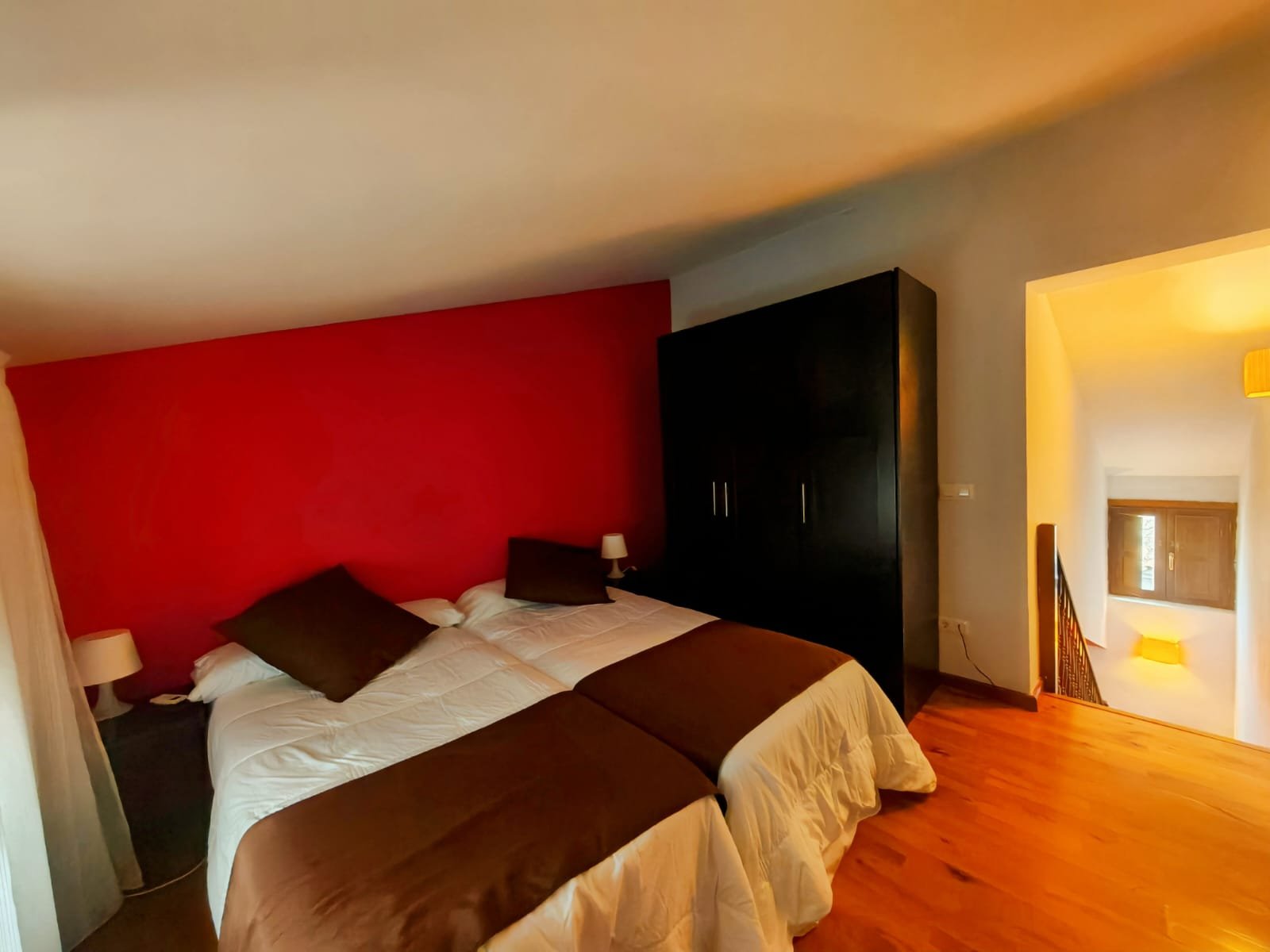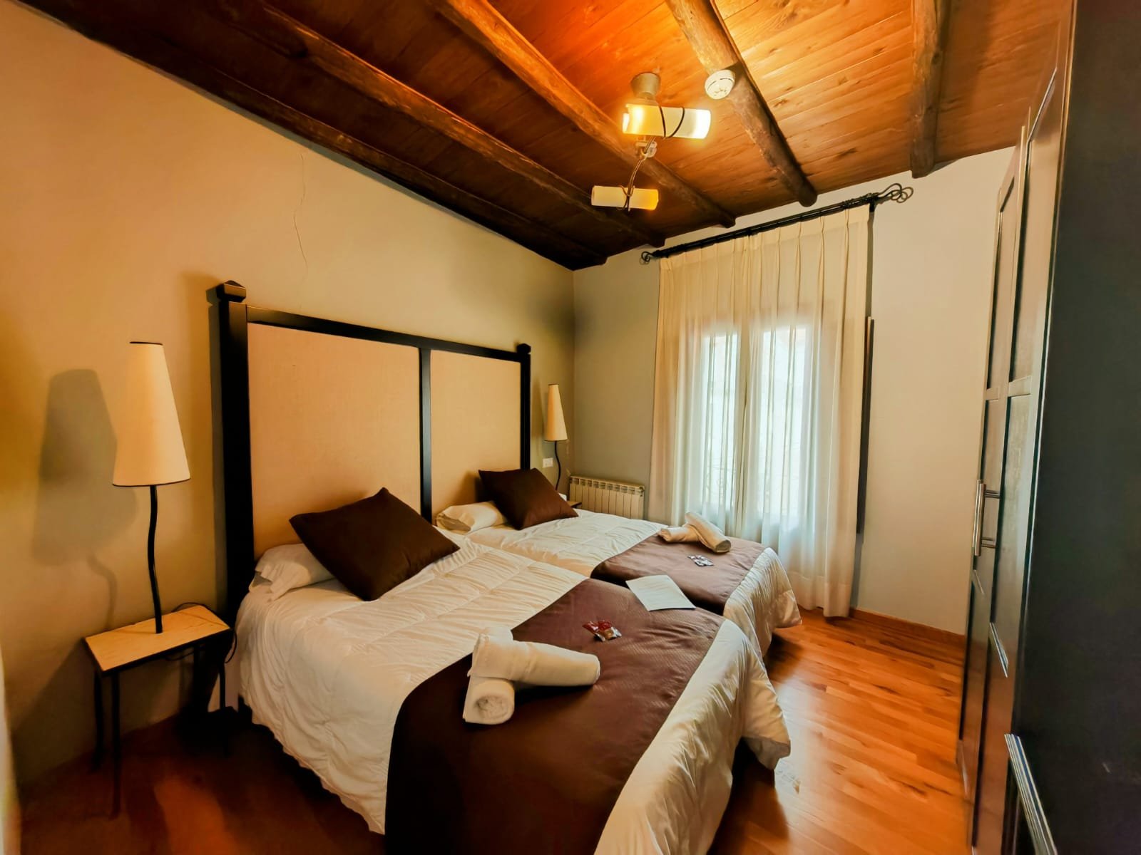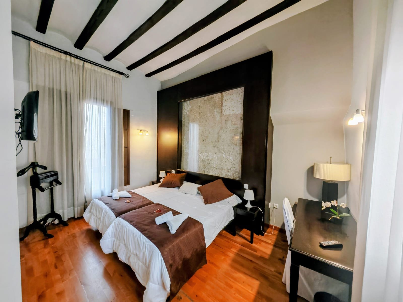 Hotel con encanto distribuido en Siete habitaciones todas con baño completo, aire acondicionado con bomba de calor. Cuatro de las habitaciones tiene sala de estar dos ellas son dobles. Se pueden convertir en triples y una individual. Todas ellas con unas vistas espectaculares y una de ellas es la joya de la posada por su luz, sus vistas y por el mural de pinturas tardo góticas que representan el diluvio universal.
